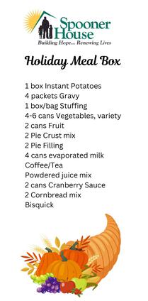 Donate items for our holiday meal boxes or provide a complete meal! This is a great project for Youth Groups, Scout Troops, Civic Organizations, Businesses, Faith Communities, Families, Friend Groups!